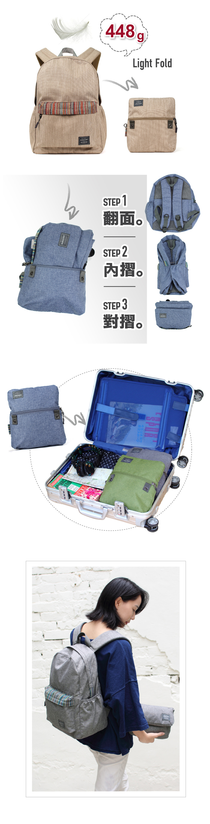 The entire backpack folds into a zip pouch — perfect for travel!
