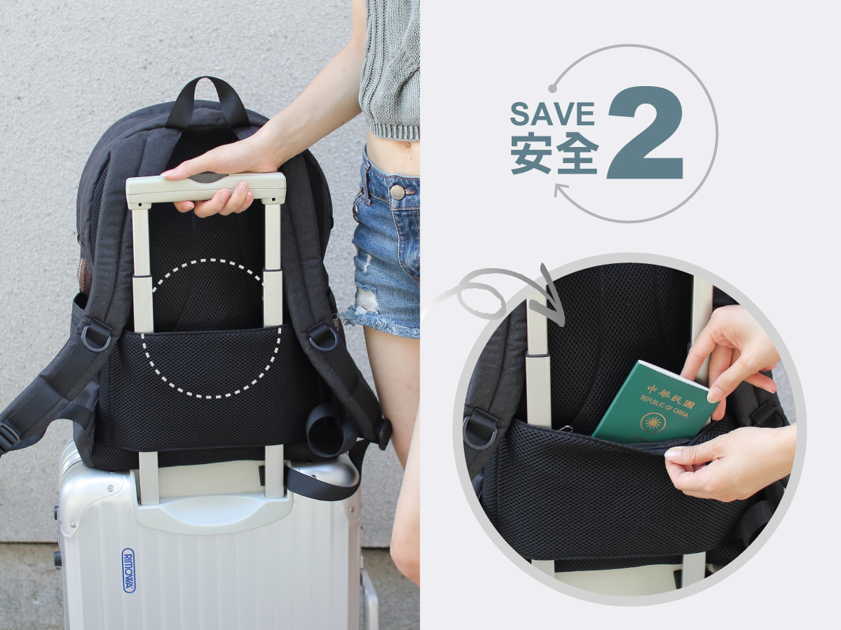 ▲ 可輕鬆取放護照、登機證、現金手機的背部隱形防盜拉鍊袋,安全又便利。