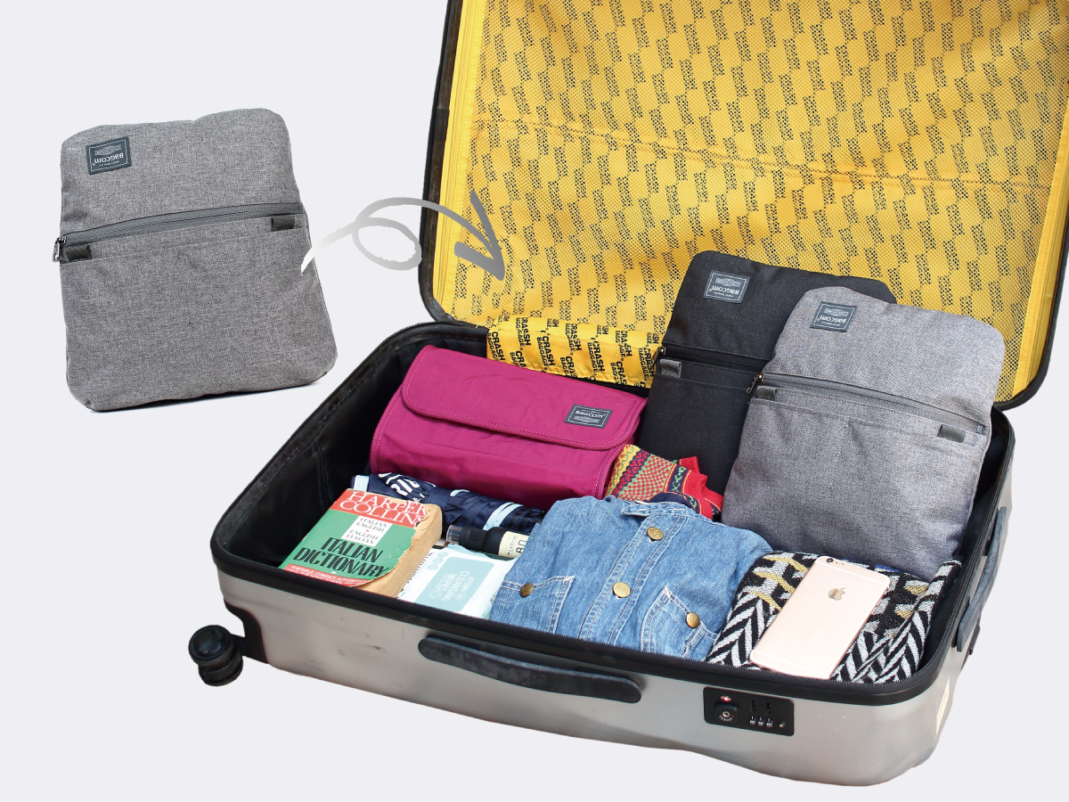 可將整個背包收進拉鍊收納袋中,方便帶出國使用,不佔行李箱空間;家中收納也不佔位。(下圖為 29”行李箱)