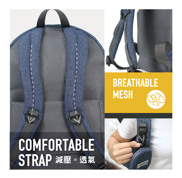 優質面料抗水性、人體工學減壓背帶(1公分厚)、背部排汗透氣網,全面提升後背舒適度。