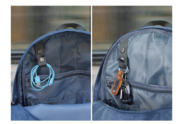 遮棚搭配防盜釦鎖,內有夾層可再分類擺放,以及備有票卡夾勾可使用。