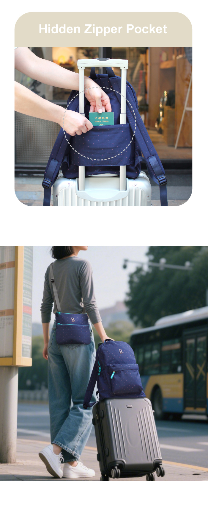 可輕鬆套入行李箱拉桿中,拉桿插袋內隱形拉鍊袋,安全放置護照、鈔票…等重要物品,應該是除了身上以外最安全的位置了