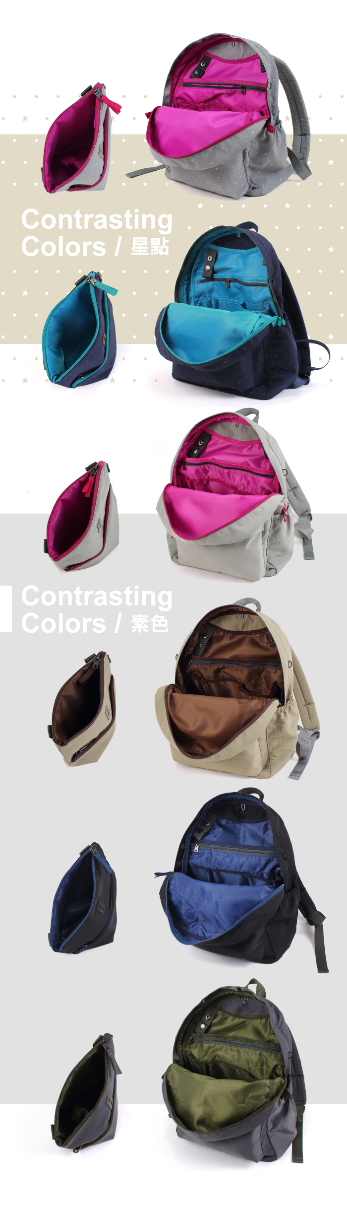 ✔拉鍊織帶&內裡採撞色配色